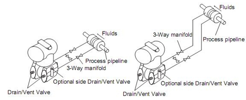 - Installez des robinets sur le côté de la ligne et montez l'émetteur sous les robinets pour maintenir les lignes d'impulsion remplies de condensat.