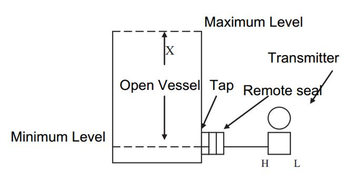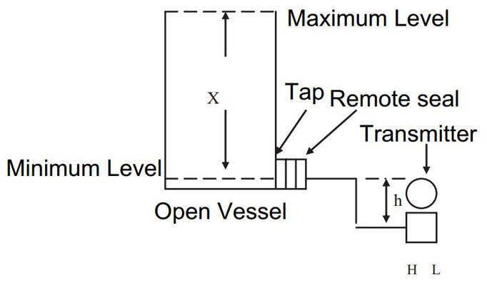 Plage ≈ ρ·g·H (par exemple, 1 000 kg/m³ × 9,80665 m/s² × hauteur). Si le transmetteur n'est pas à la même altitude que le robinet de fond, inclure les corrections de hauteur dues aux différences d'altitude et à tout fluide de remplissage.